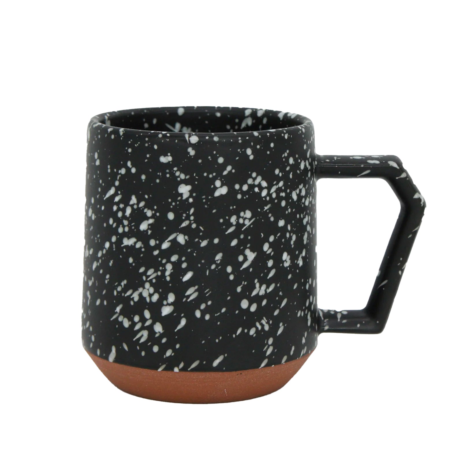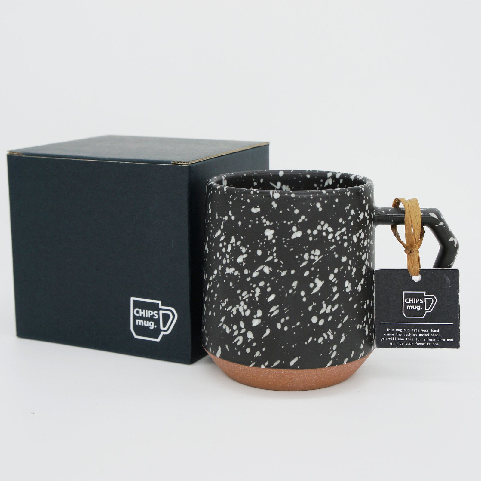 The silhouette of the product was created from the mold in pursuit of user-friendliness and ease of holding. Despite its large capacity of 380ml, it fits snugly in the hand and can be lifted without feeling heavy. This stunning mugs are dip glazed in a splatter and leaving the base exposed. The unique handle shape is satisfying to hold, anytime of the day!