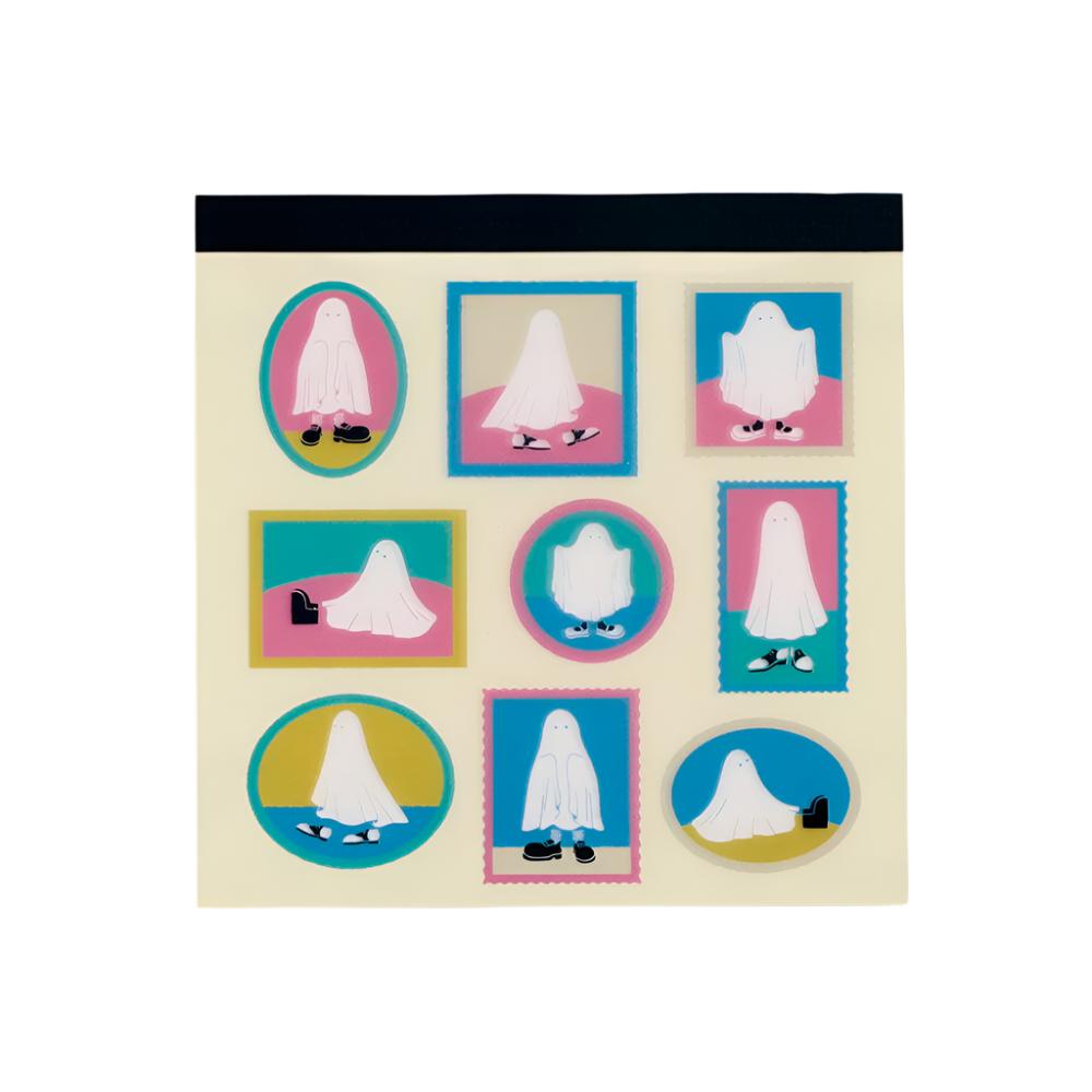 Notepad with a colourful pop design of slightly mischievous ghosts featuring 4 page designs with colourful pop design of ghosts dressed up in shoes and socks.