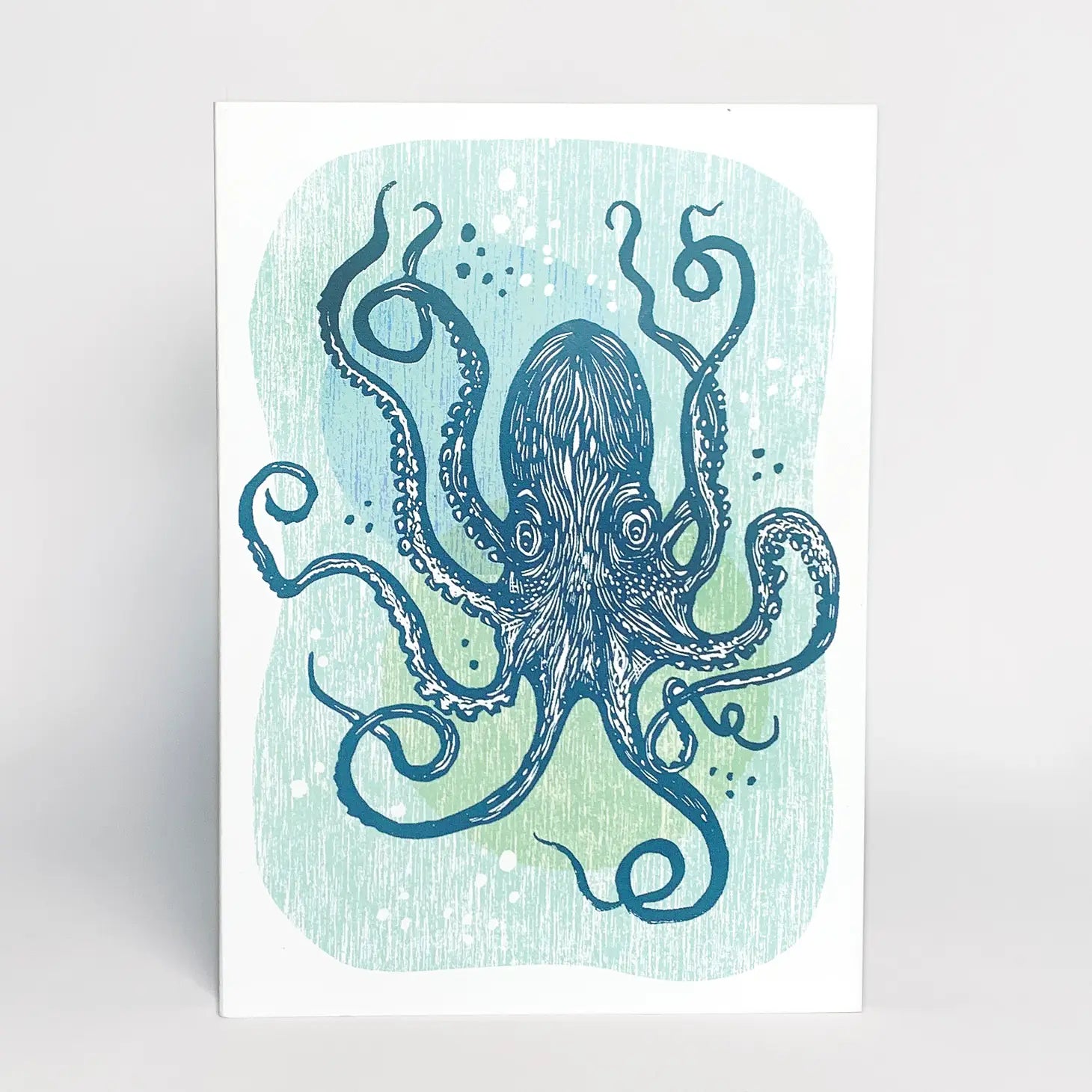 A commercially printed reproduction of an original artwork made using traditional methods of printmaking (linocut, woodcut, custom inks, hand-pulled prints on a manual etching press). Based in Mayne Island, BC.
