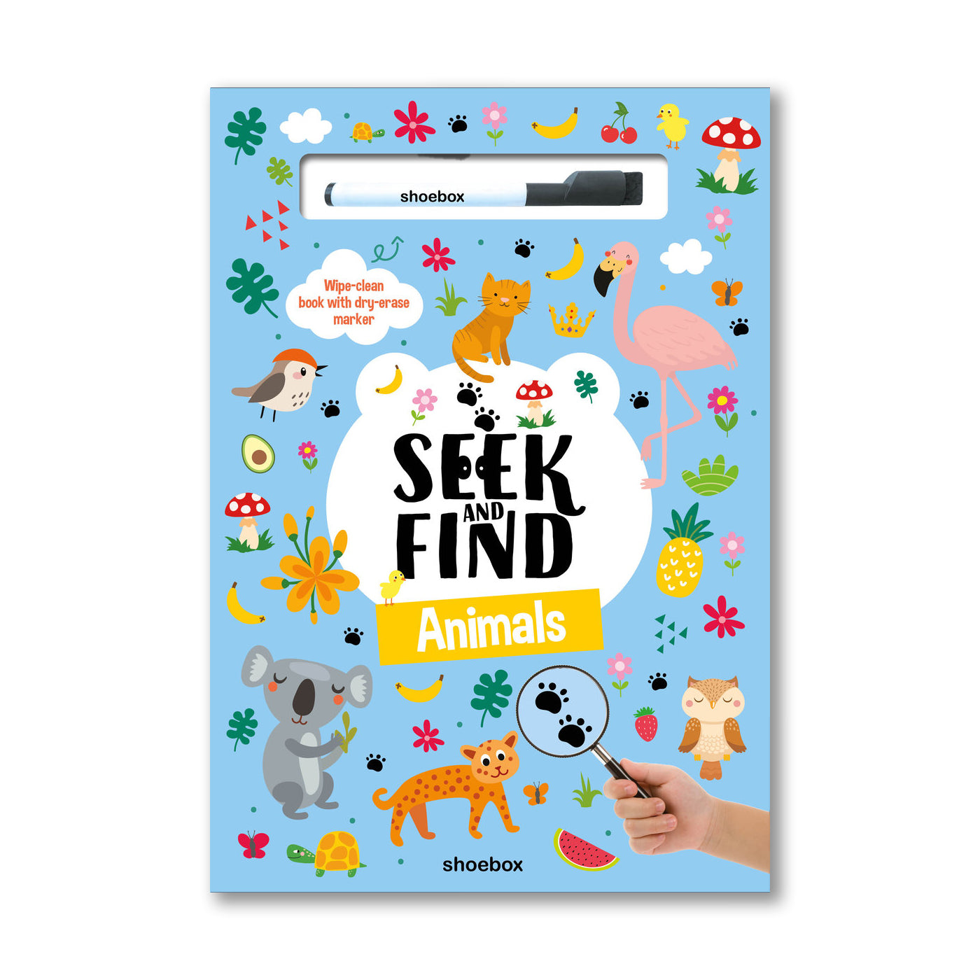 Search and find the animals among these large slate pages and circle them with the erasable pencil. Once erased, will you remember where they are hidden?